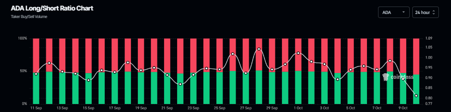 En el lado de los derivados, el ratio largo-corto de ADA de CoinGlass, que se sitúa en 0.81 el viernes, es el nivel más alto en más de un mes. Este ratio, por debajo de uno, refleja un sentimiento bajista en los mercados, ya que más operadores están apostando a que el precio del activo caerá.