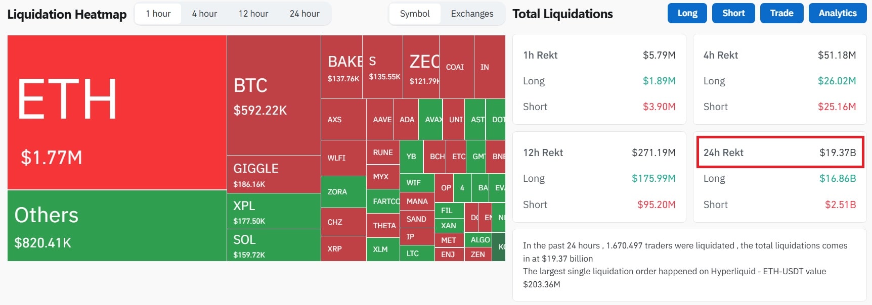 Este evento supera con creces cualquier otro registrado en el año, eclipsando las liquidaciones de casi USD $3 mil millones en 24 horas observadas el 21 de septiembre, según datos de Coinglass, y al menos un comerciante ha descrito el episodio como posiblemente el evento de liquidación “más grande” en términos de dólares en la historia de las criptomonedas.