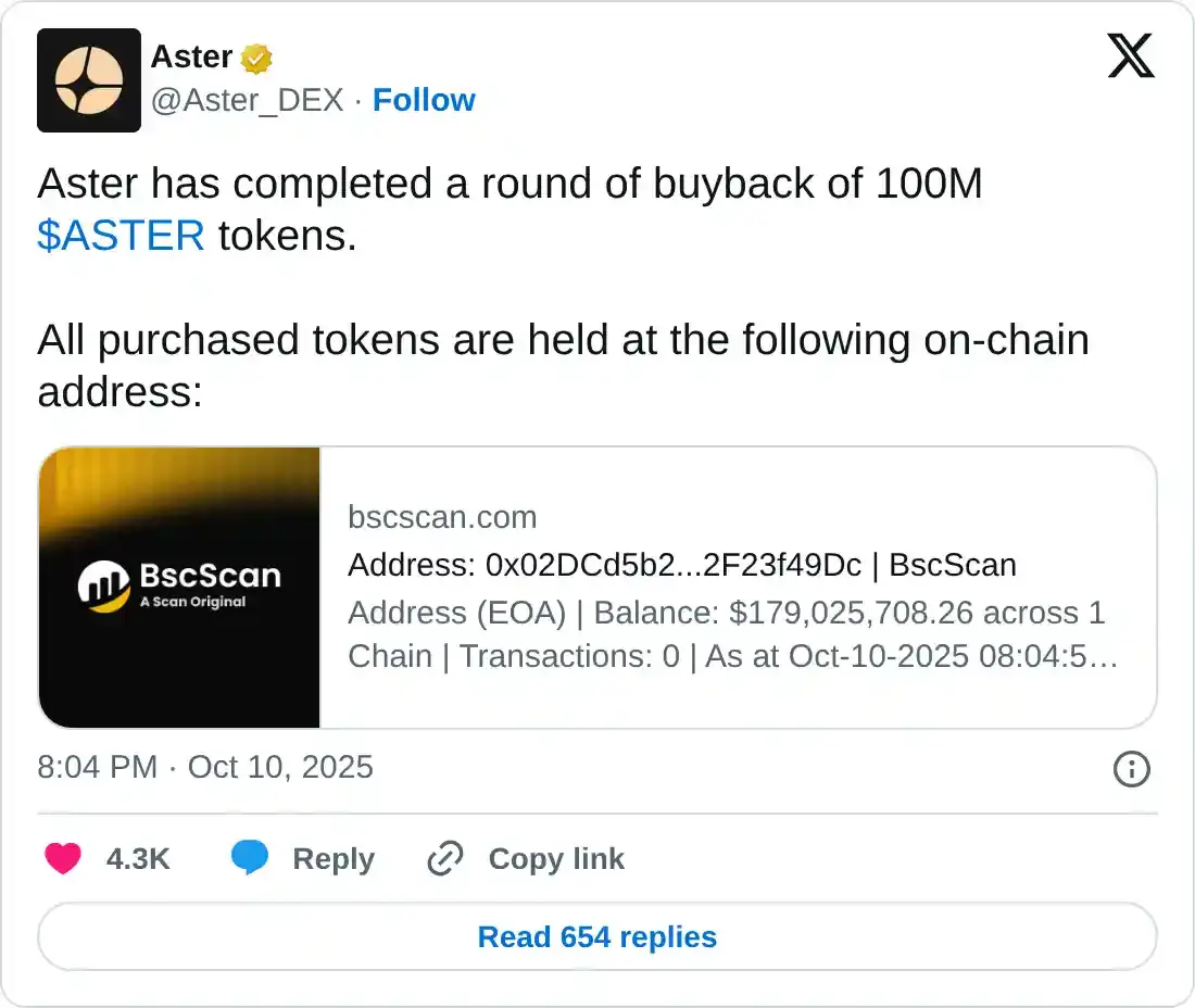 Aster avanza un 1% en el momento de escribir el lunes, extendiendo las ganancias del 23% del día anterior. El token DEX perp experimentó un rebote debido a recompras de 100 millones de ASTER el sábado, creando demanda al reducir la oferta.
