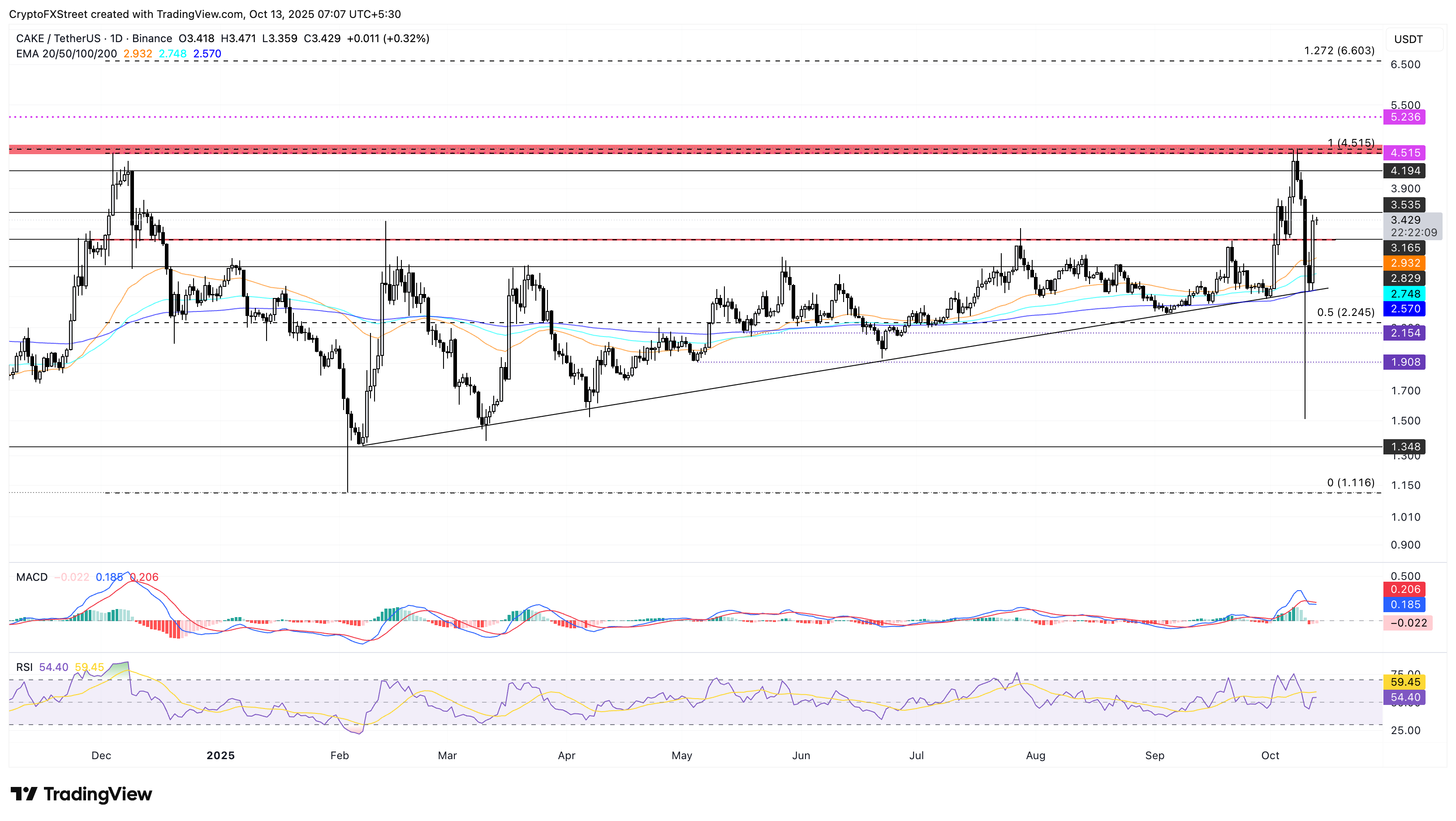 PancakeSwap se negocia por encima de 3.400$ en el momento de la publicación el lunes, manteniendo las ganancias del 29% del domingo. El token del Intercambio Descentralizado (DEX) rebotó el domingo desde la media móvil exponencial (EMA) de 200 días y una línea de tendencia de soporte local, formando una vela envolvente alcista para poner fin a una racha de cuatro días consecutivos de pérdidas.