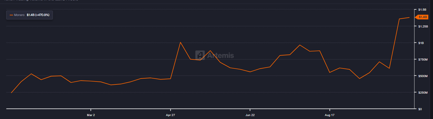 Gráfico del volumen de operaciones semanal de XMR. Fuente: Artemis