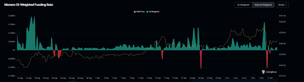 Los datos de la tasa de financiación ponderada por OI de CoinGlass muestran que el número de operadores que apuestan a que el precio de Monero caerá más es menor que el de aquellos que anticipan un aumento de precio.