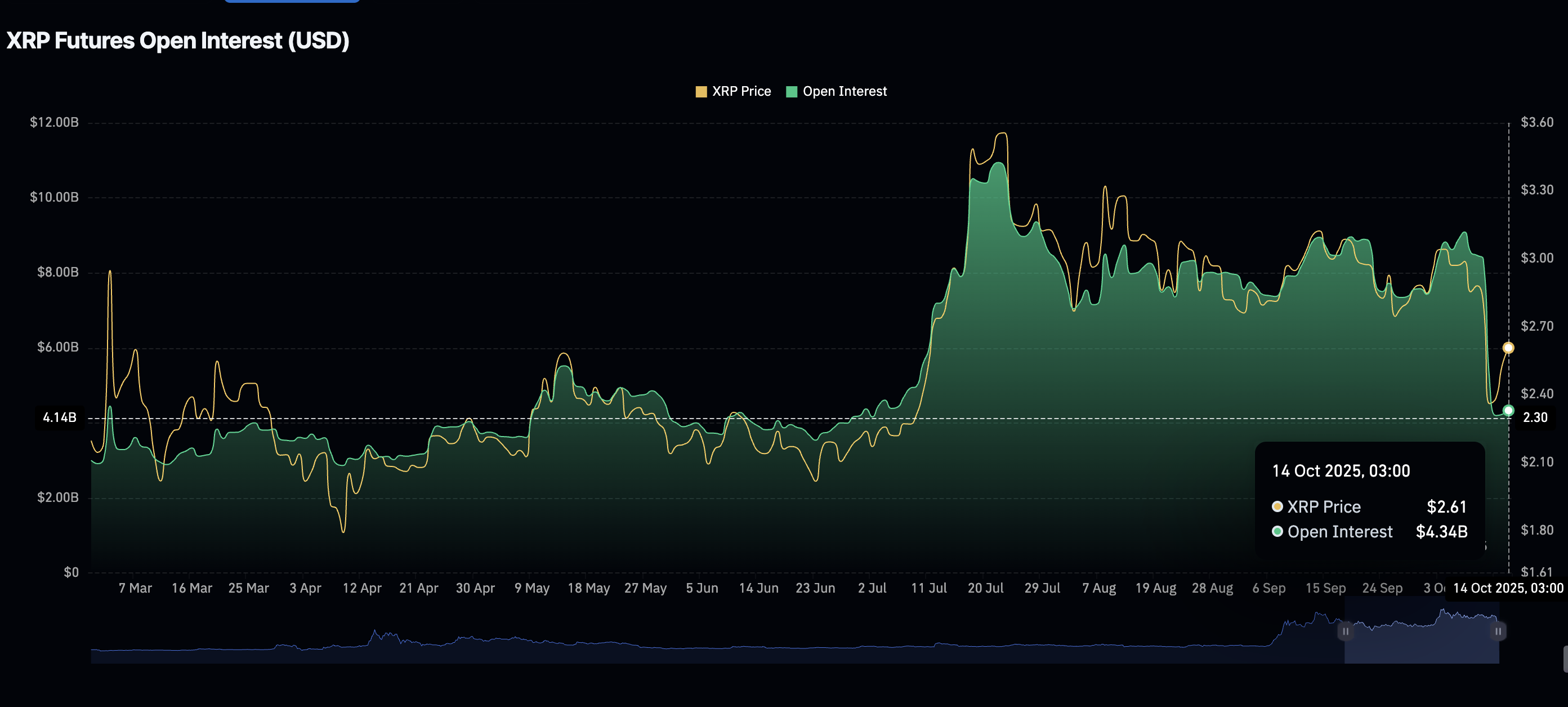 Por otro lado, el interés minorista en XRP se ha estabilizado en los últimos días. Sin embargo, sigue siendo significativamente inferior al nivel visto durante el evento de desapalancamiento de la semana pasada, que provocó liquidaciones masivas. El Interés Abierto (OI) de futuros de XRP promedia 4.34 mil millones$ el martes, después de aumentar a aproximadamente 9 millones$ el 7 de octubre.