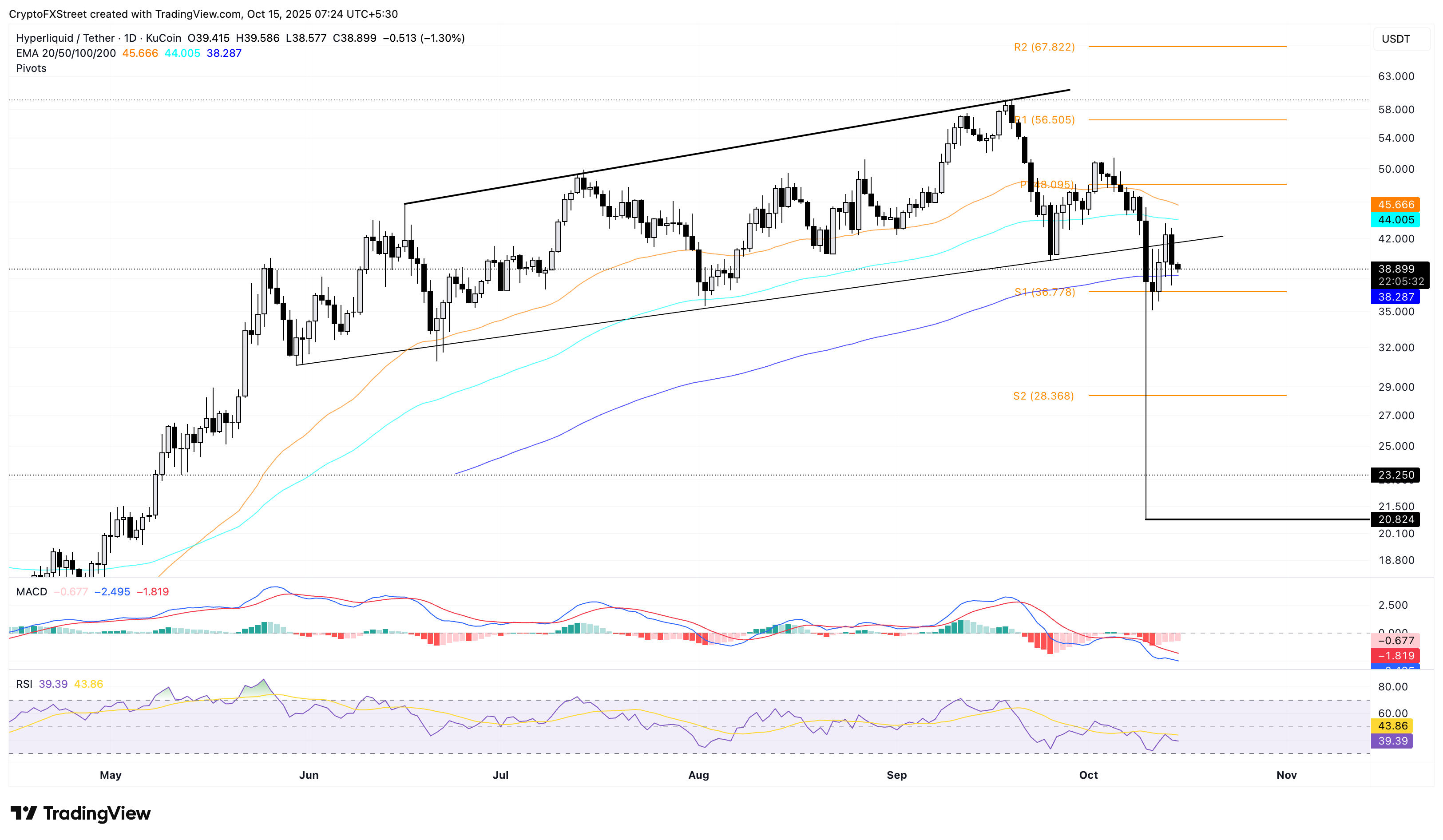 Hyperliquid se desplaza a la baja más del 1% al momento de la publicación el miércoles, extendiendo la pérdida del 7% del martes. El retroceso en el token de Intercambio Descentralizado (DEX) borra las ganancias del lunes y arriesga una posible caída por debajo de la Media Móvil Exponencial (EMA) de 200 días en 38.28$.