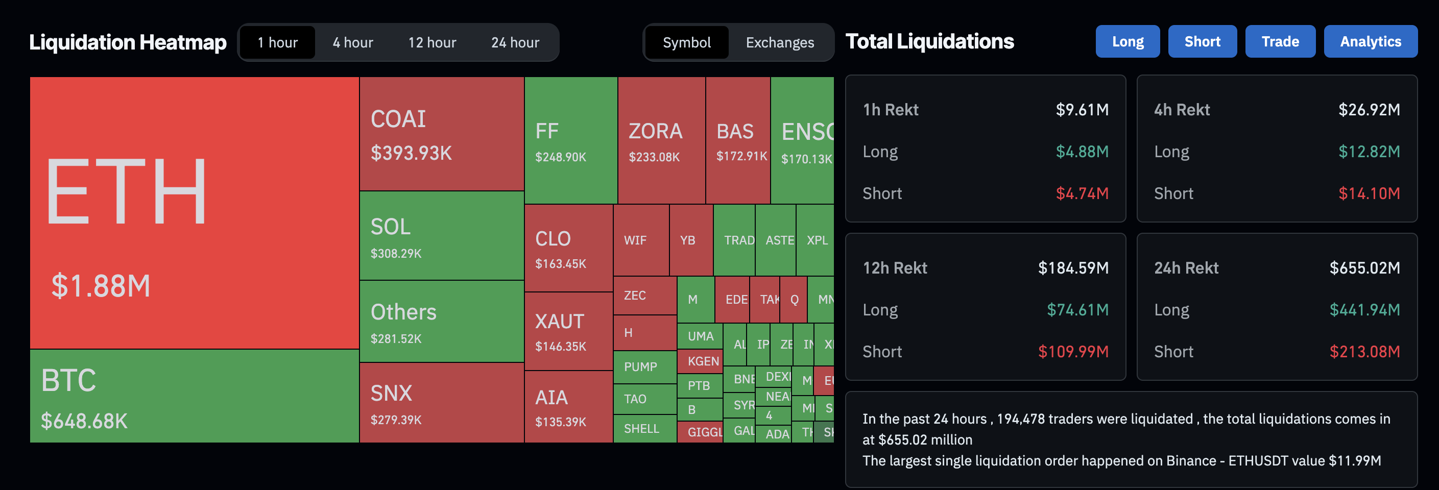 El mercado de criptomonedas sufrió 655 millones de dólares en liquidaciones totales en las últimas 24 horas a medida que aumentaron las tensiones arancelarias entre EE.UU. y China. El presidente de EE.UU., Donald Trump, mencionó una posible suspensión en el comercio de aceite de cocina con China, lo que llevó a que el Bitcoin cayera por debajo de los 113.000$ y presionara a otras altcoins principales.