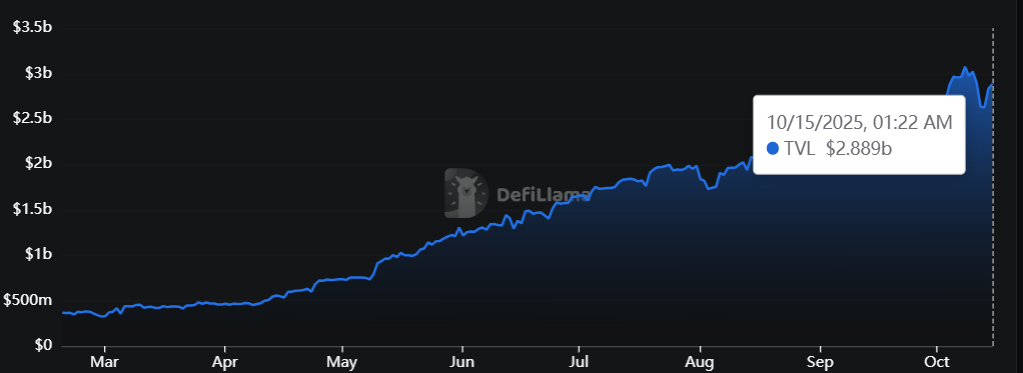 Los datos de DefiLlama muestran que el TVL de Maple Finance aumenta a 2.88 mil millones $ el miércoles desde 2.63 mil millones $ el domingo, acercándose a su máximo histórico de 3.07 mil millones $ alcanzado el 8 de octubre. El aumento del TVL indica una creciente actividad e interés dentro del ecosistema de SYRUP, sugiriendo que más usuarios están depositando o utilizando activos dentro de los protocolos basados en SYRUP.