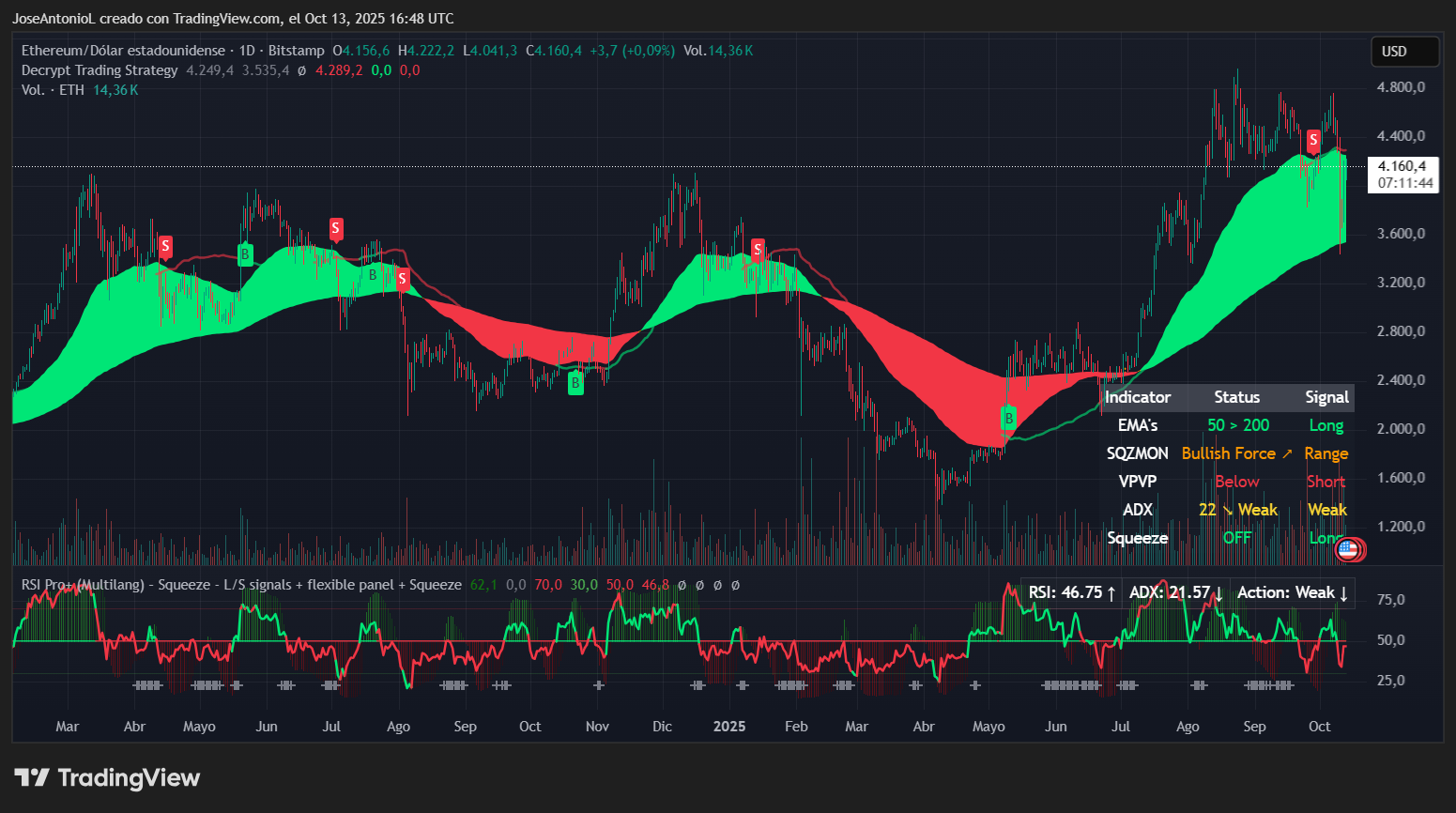 Como Bitcoin, ETH mantiene su cruz dorada con el 50-EMA por encima del 200-EMA, preservando la estructura alcista a largo plazo. El indicador Squeeze Momentum disparando "off" con una señal Long sugiere que la fase de consolidación está terminando con un sesgo alcista—pero con lecturas de ADX tan débiles, cualquier movimiento al alza puede carecer de seguimiento.