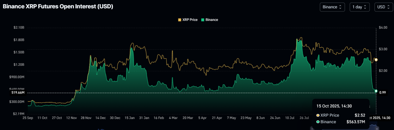 Mientras tanto, los derivados de XRP muestran signos de debilidad, con el interés abierto de futuros (OI) cayendo a 563,57 millones de dólares el miércoles, alcanzando niveles no vistos desde noviembre de 2024, reflejando una participación de inversores en declive.