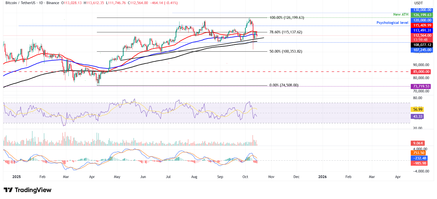 El precio de Bitcoin se recuperó ligeramente el domingo y cerró por encima de 114.900$ tras una fuerte caída el viernes. Al momento de escribir el miércoles, BTC se sitúa alrededor de 112.500$ después de ser rechazado del nivel de retroceso de Fibonacci del 78.6% en 115.137$, dibujado desde el mínimo de abril de 74.508$ hasta el máximo del 6 de octubre de 126.199$, y la media móvil exponencial (EMA) de 50 días en 115.409$ a principios de semana.