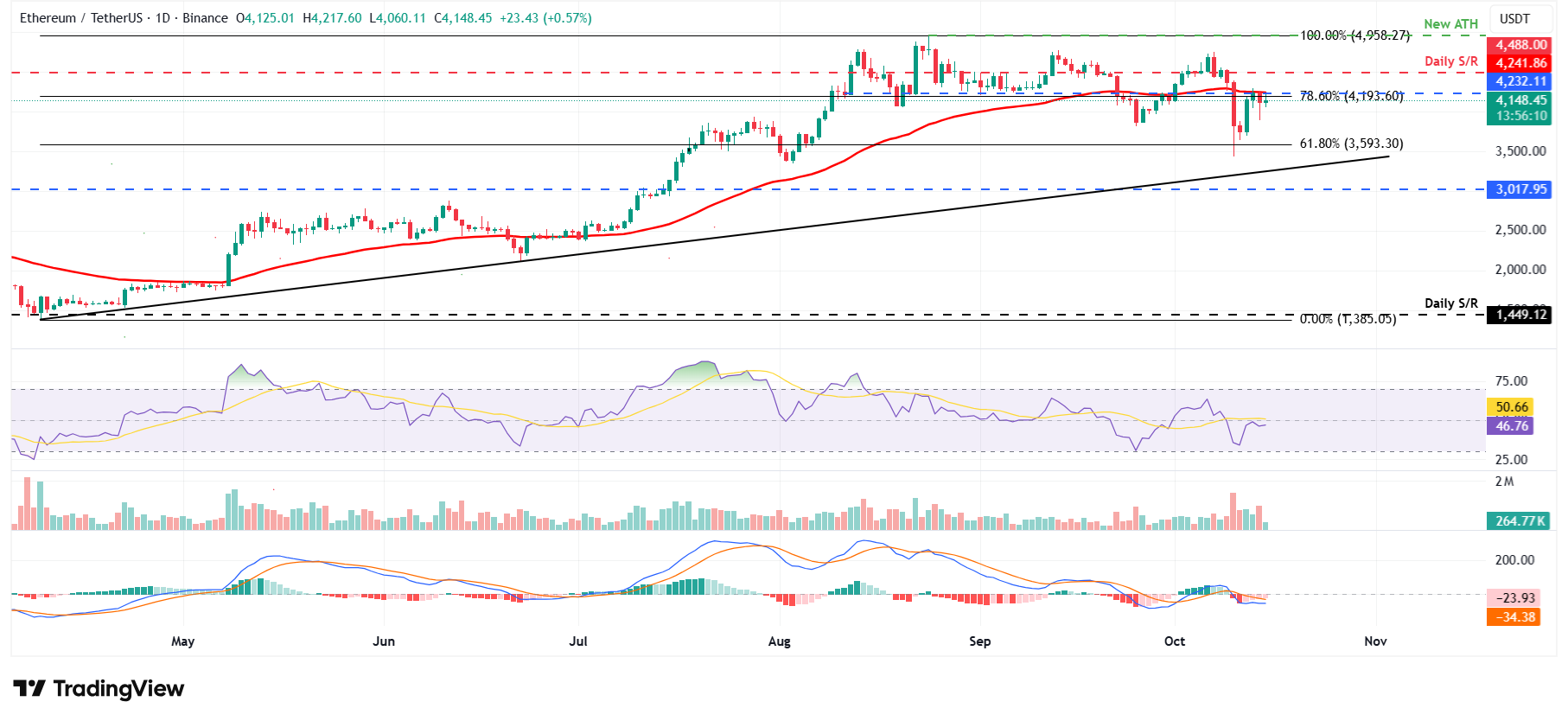 El precio de Ethereum encontró soporte alrededor del nivel de retroceso de Fibonacci del 61.8% en 3.953$ (dibujado desde el mínimo de abril de 1.385$ hasta el máximo histórico de 4.956$) el sábado y se recuperó un 13% en los siguientes dos días. El martes, ETH cayó ligeramente después de caer por debajo del nivel de resistencia diario en 4.232$, que coincide aproximadamente con la EMA de 50 días y el nivel de retroceso de Fibonacci del 78.6%. Al momento de escribir el miércoles, se sitúa alrededor de 4.140$.