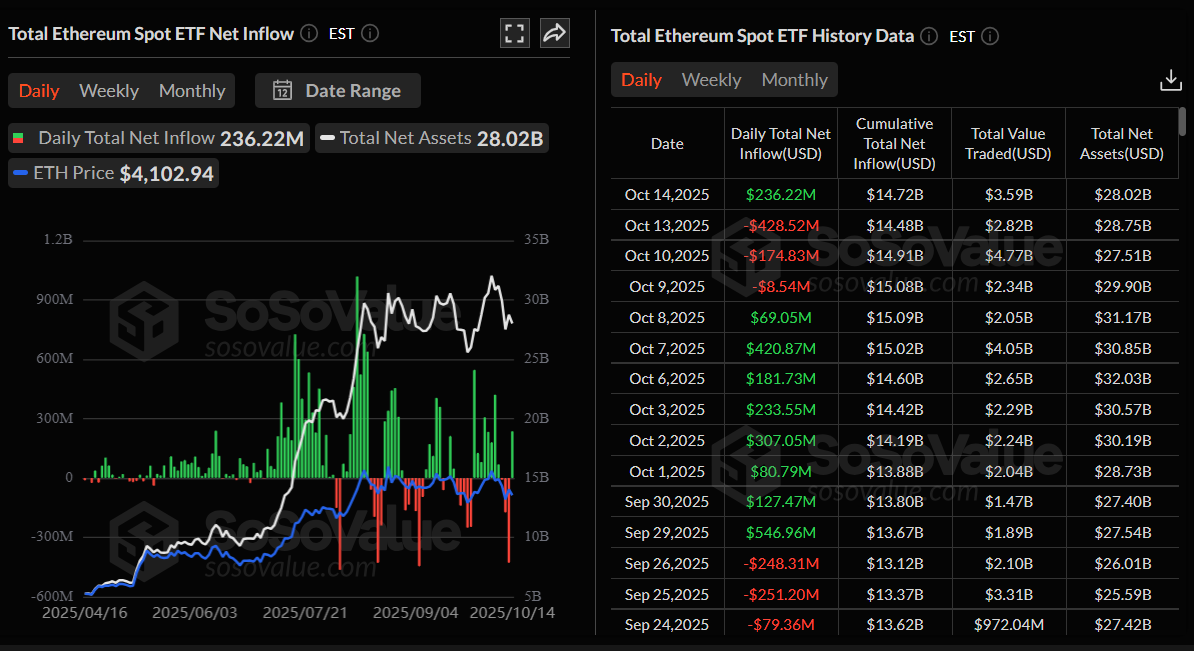 La demanda de ETFs de Ethereum al contado también ha mostrado una leve fortaleza. El gráfico a continuación muestra que los ETFs de Ethereum al contado registraron una entrada moderada de 236,22 millones de dólares el martes, rompiendo la racha de salidas de tres días.