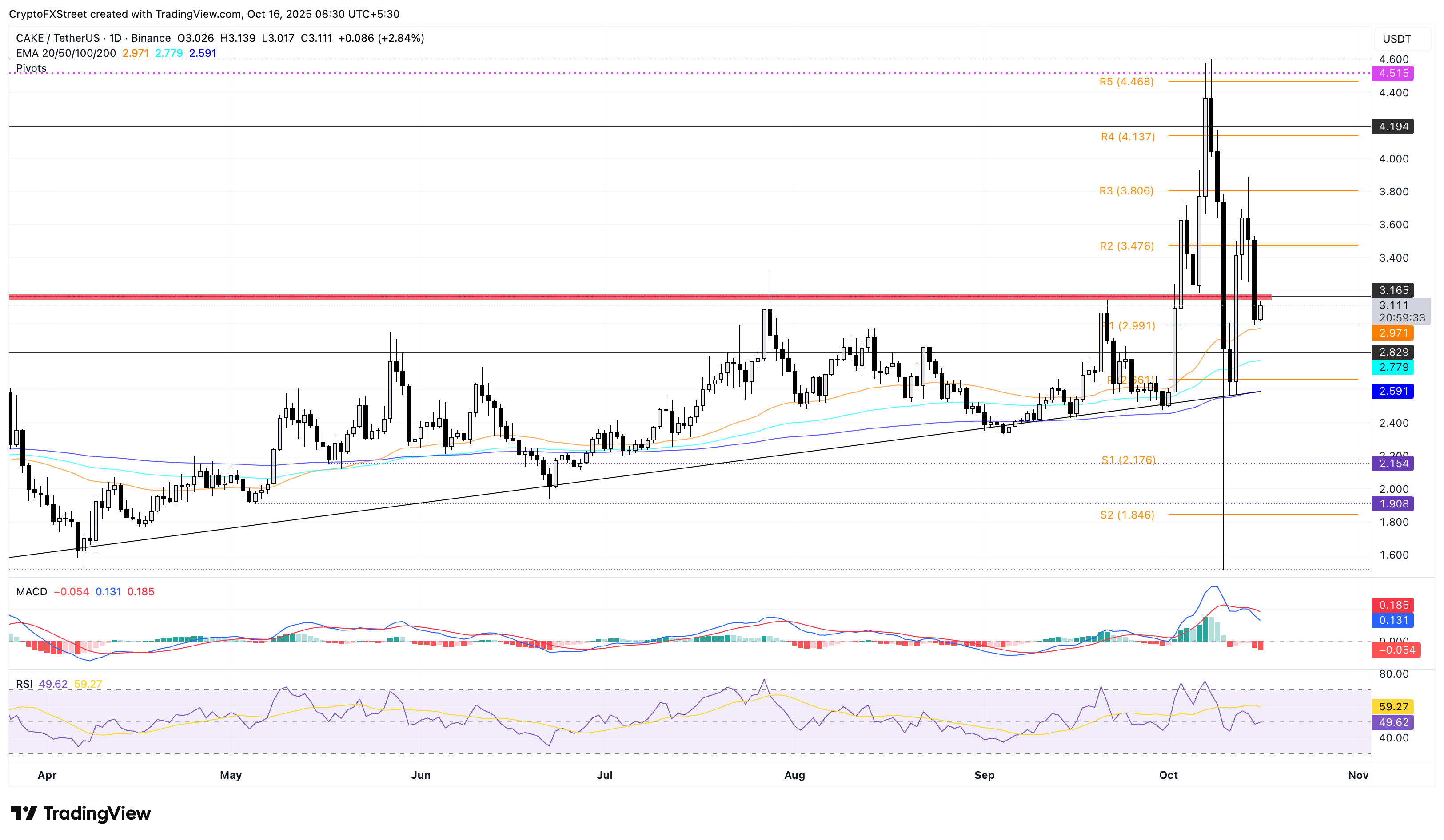 PancakeSwap avanza casi un 3% al momento de escribir el jueves, recuperándose tras dos días consecutivos de pérdidas. El token DEX se mantiene por encima de la EMA de 50 días en 2.971$, desafiando el nivel de 3.165$ como resistencia inmediata, que mantuvo los precios bajo control durante los rebotes de julio y septiembre.