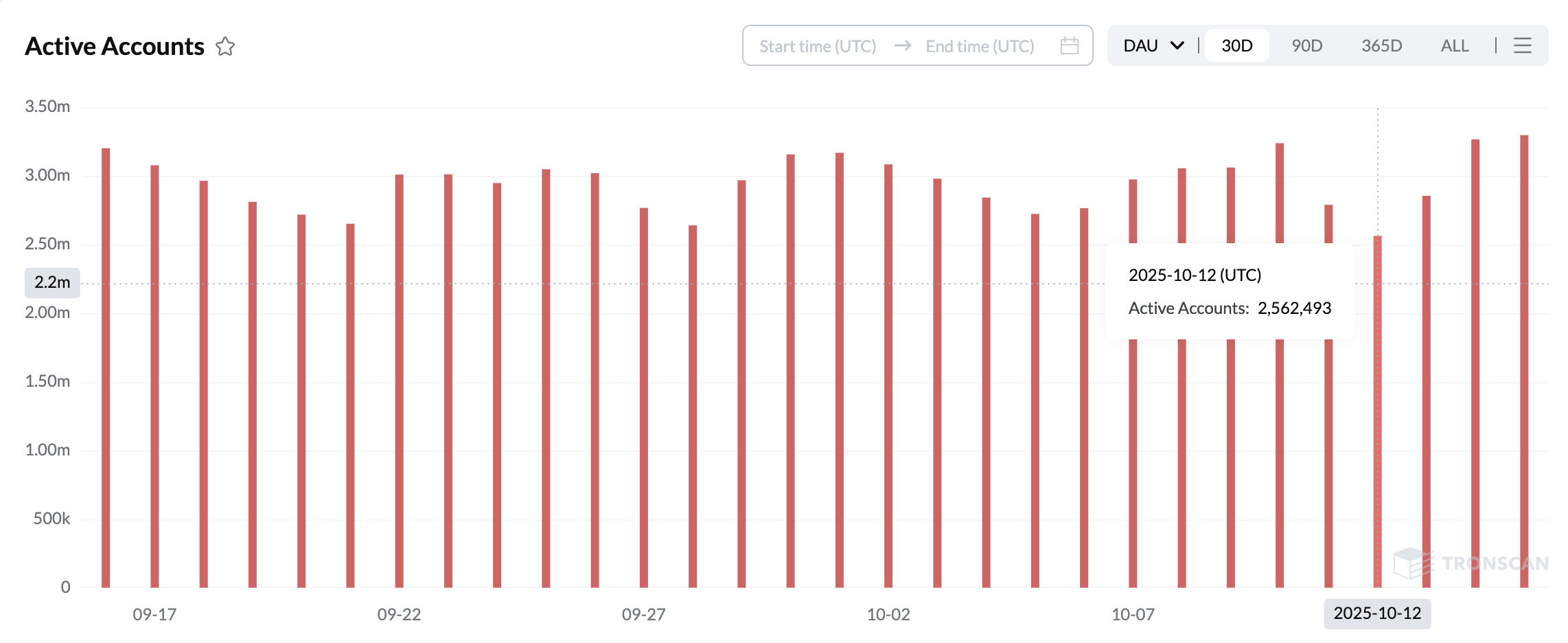 La blockchain de Tron ha experimentado un aumento constante en la actividad de la red durante los últimos 30 días, como lo indica el incremento en el número de cuentas activas y los ingresos de la red. Según los datos de TronScan, el número de cuentas activas promedia alrededor de 3 millones en los últimos 30 días.