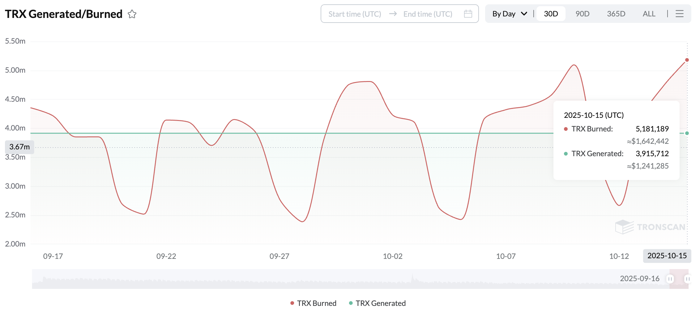 Mientras tanto, la disponibilidad del token nativo de Tron está disminuyendo a medida que el proceso de quema supera la generación de TRX. La presión deflacionaria está aumentando gradualmente tras la reciente volatilidad del mercado, como lo evidencia la quema de 5.18 millones de tokens TRX en comparación con la generación constante de 3.91 millones de tokens TRX el martes. Un aumento constante en la deflación podría llevar a un aumento en el precio de TRX basado en la lógica general de oferta y demanda.
