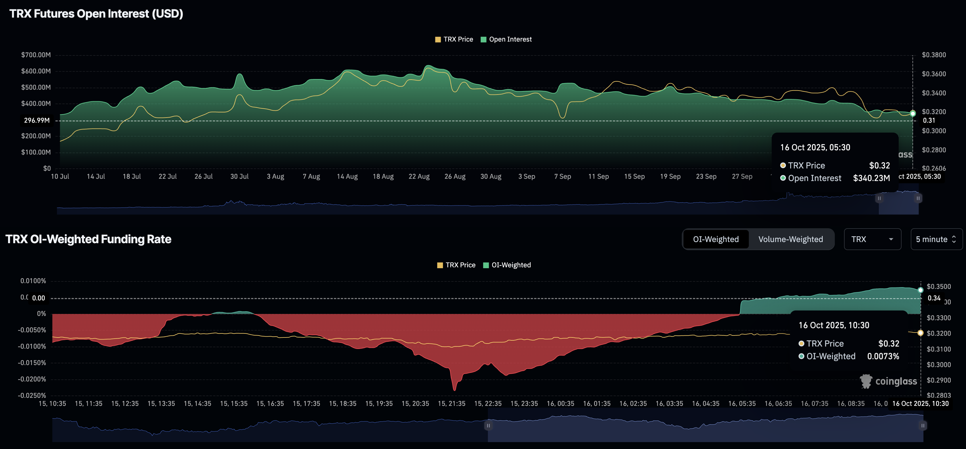 La demanda de Tron continúa fluctuando, un efecto secundario de la volatilidad del mercado en general. Los datos de CoinGlass muestran una disminución constante en el interés abierto de futuros de TRX (OI), que se sitúa en 340.32 millones de dólares el jueves. Una tendencia a la baja en el OI indica que los participantes del mercado están asustados, lo que resulta en una desapalancamiento o retiro de capital.