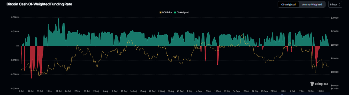 En el lado de los derivados, Bitcoin Cash también apoya una perspectiva bajista. Los datos de Tasa de Financiamiento Ponderada por OI de CoinGlass muestran que el número de operadores que apuestan a que el precio de BCH caerá más es mayor que aquellos que anticipan un aumento de precio.
