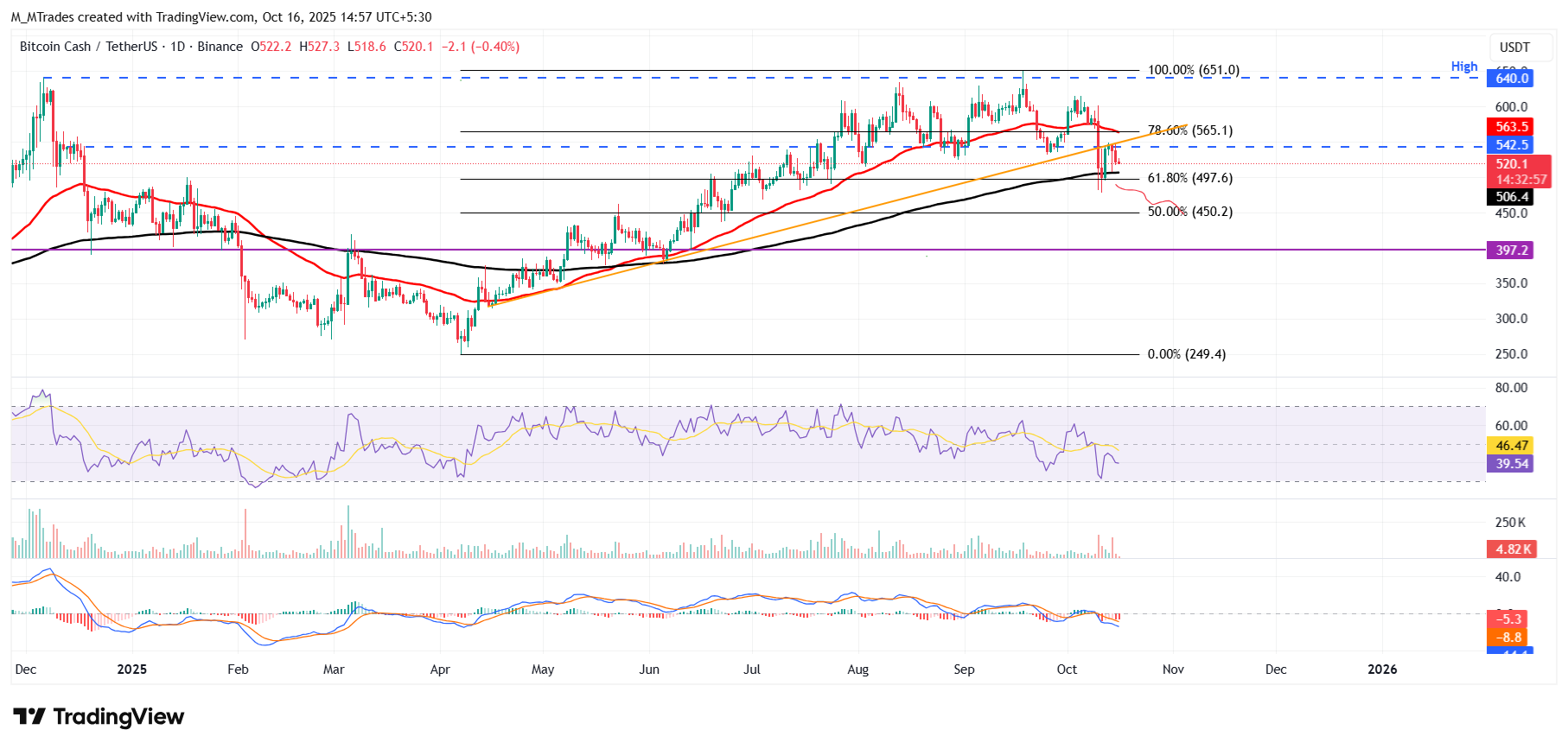Bitcoin Cash (BCH) cotiza en rojo por debajo de 520$ al momento de escribir el jueves, después de enfrentar rechazo de una línea de tendencia previamente rota a principios de esta semana. El aumento en la actividad de toma de beneficios y los datos bajistas de derivados indican que la presión de venta puede persistir a corto plazo. BCH podría estar preparado para una corrección más profunda hacia la marca de 450$ ya que las tasas de financiamiento se están volviendo negativas y los indicadores de impulso apuntan a la baja.