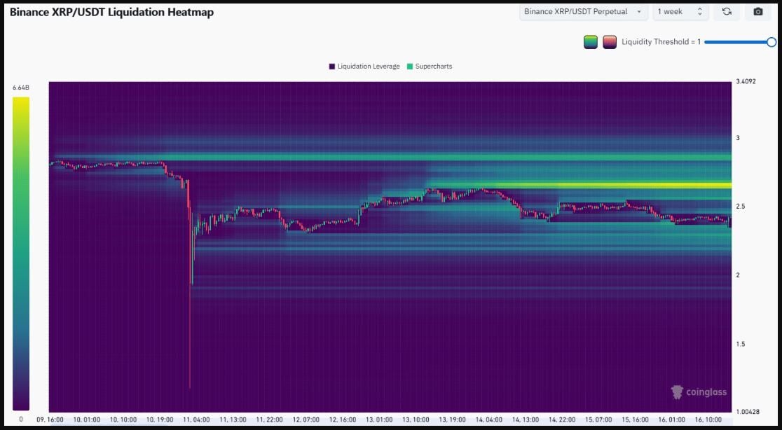 El desequilibrio por debajo de la zona de 2.8 dólares tiene una importancia especial. El mapa de calor de liquidación mostró un conjunto de niveles de liquidación cortos acumulados en 2.67 dólares. Es probable que esta zona magnética impulse a $XRP hacia los 2.7 dólares en los próximos días.