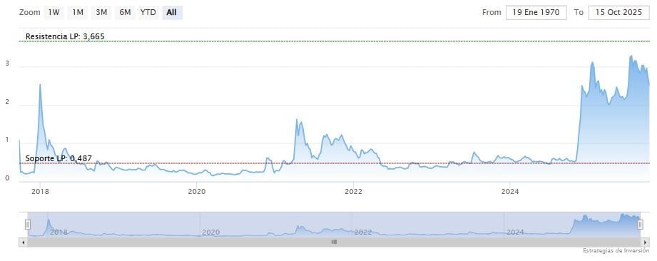 Los puntos de oscilación en el marco temporal semanal estaban marcados en verde, en 0.486 y 3.4 dólares.