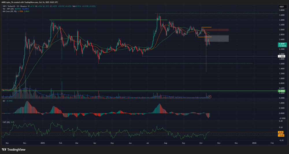 Sin embargo, el sesgo por ahora es bajista. Esto se debe a que los alcistas de $XRP habían defendido la zona de demanda de 2.7 a 2.8 dólares de las nuevas pruebas bajistas desde julio, pero la reciente presión de venta obligó al precio a romper por debajo de este soporte.