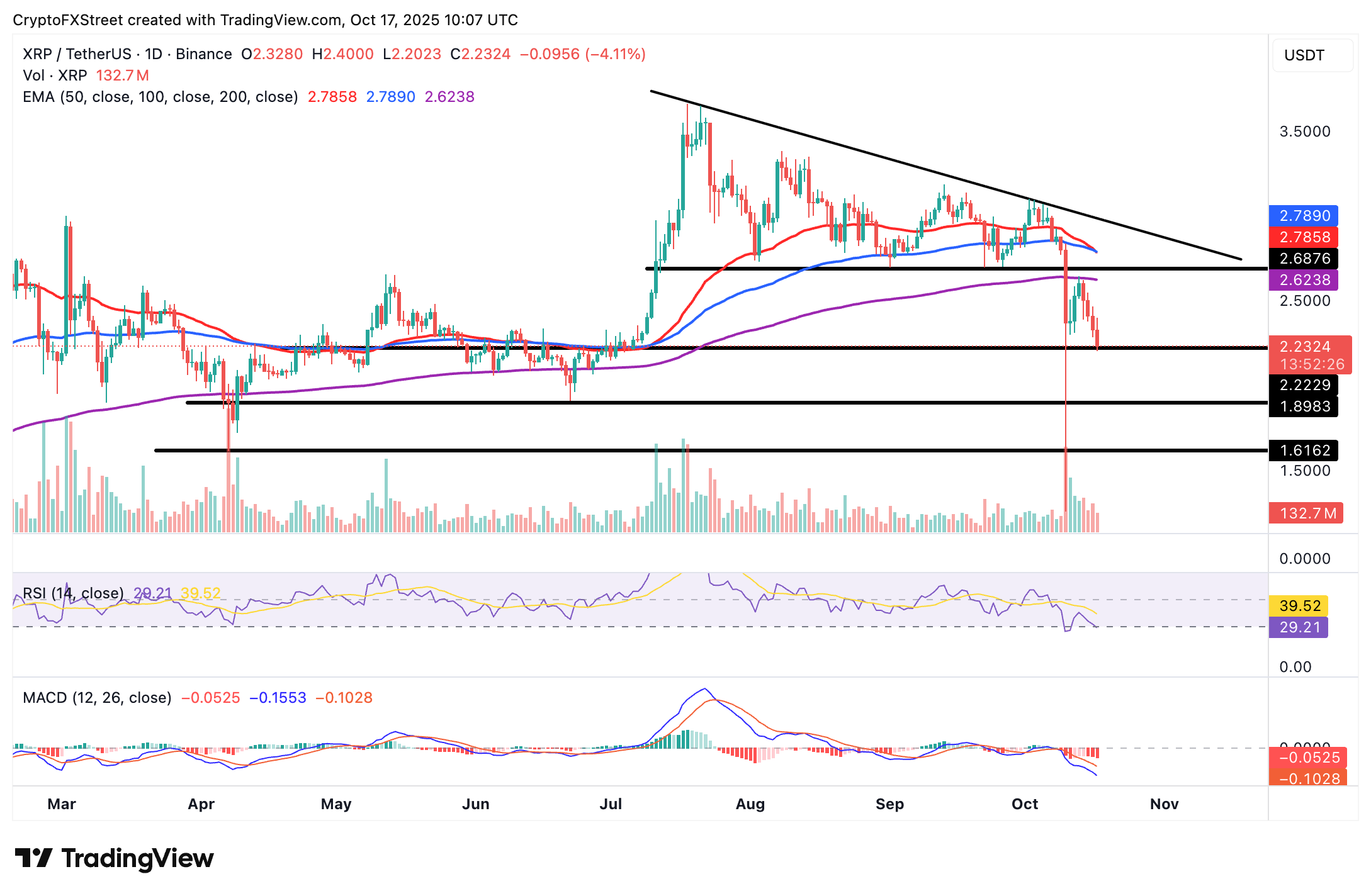 Una débil estructura técnica contribuye a la presión de venta, reflejando el indicador de Convergencia/Divergencia de Medias Móviles (MACD), que ha mantenido una señal de venta en el marco de tiempo diario desde el 10 de octubre.