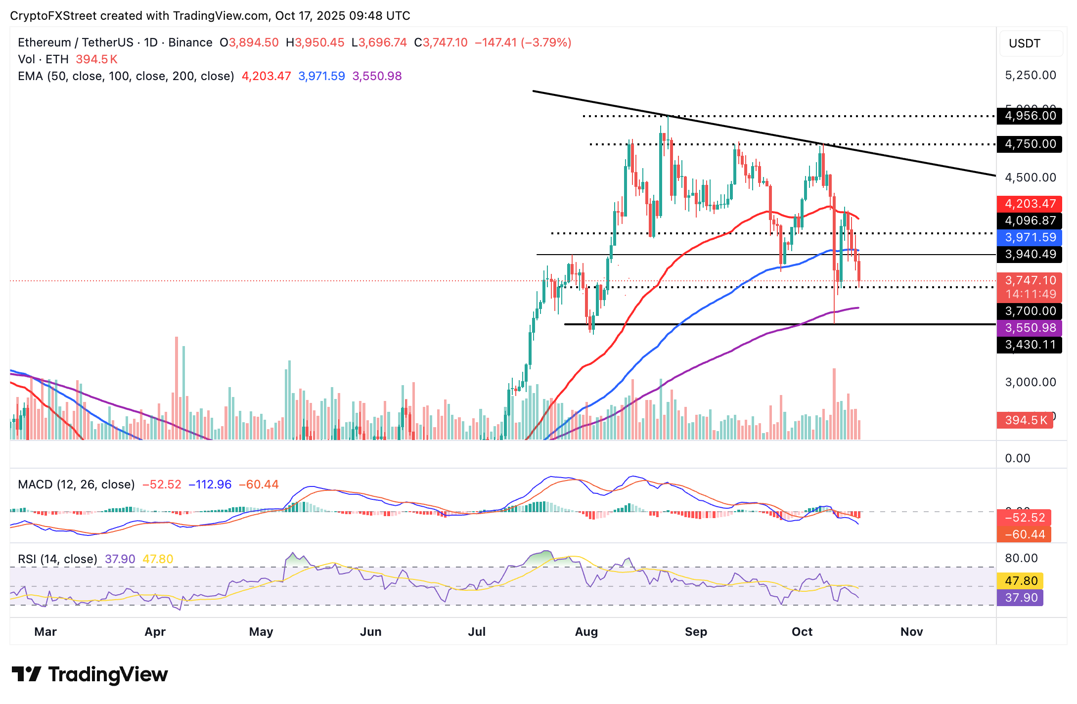Los operadores estarán atentos a un posible rebote por encima de la EMA de 100 días en 3.971$ para determinar la recuperación de ETH por encima del nivel de 4.000$.