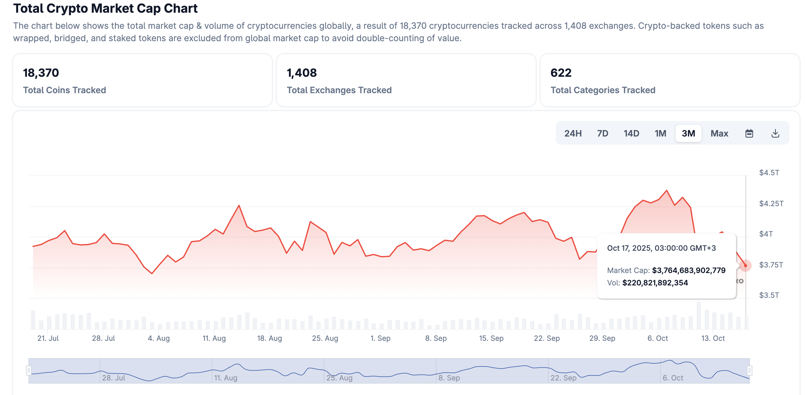Las altcoins están soportando la mayor carga, con Ethereum (ETH) cayendo a 3.700$ y Ripple (XRP) deslizándose por debajo de un soporte clave en 2.22$. La capitalización total del mercado ha bajado un 6% en las últimas 24 horas a 3,76 billones de dólares después de alcanzar un máximo de 4,38 billones de dólares el 7 de octubre, según CoinGecko.