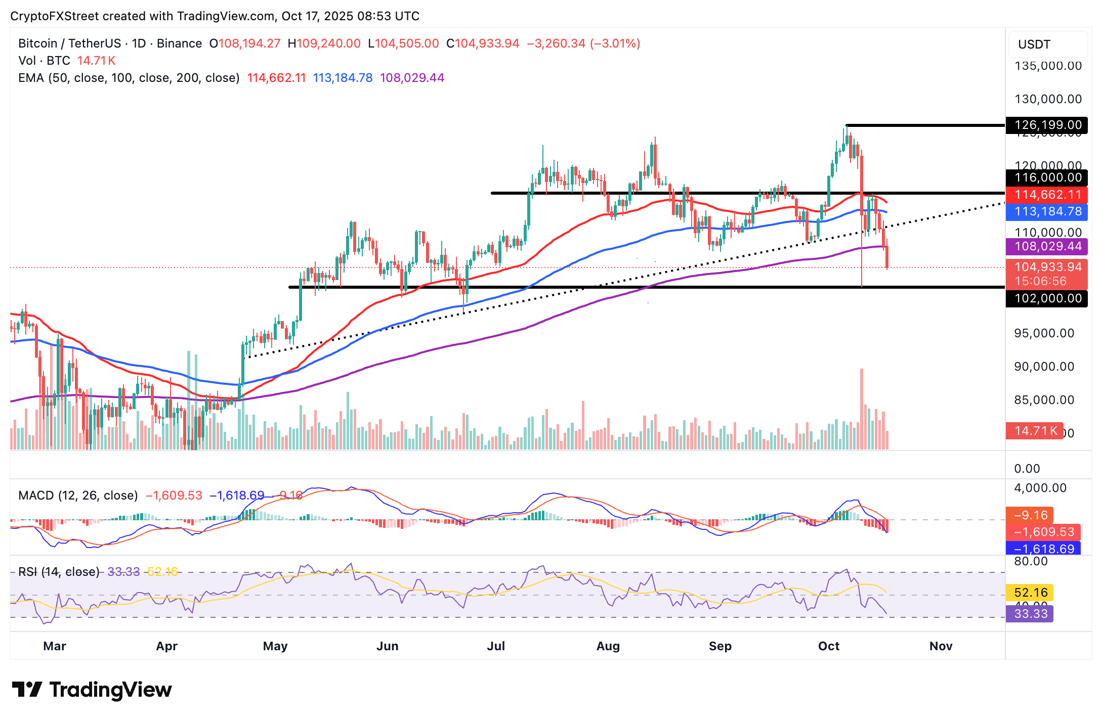 El Bitcoin se está cotizando alrededor de 105.000$ en el momento de escribir el viernes, mientras los bajistas fortalecen su control. La caída se aceleró después de que el Bitcoin perdió la Media Móvil Exponencial (EMA) de 200 días, que actualmente está en 108.029$.