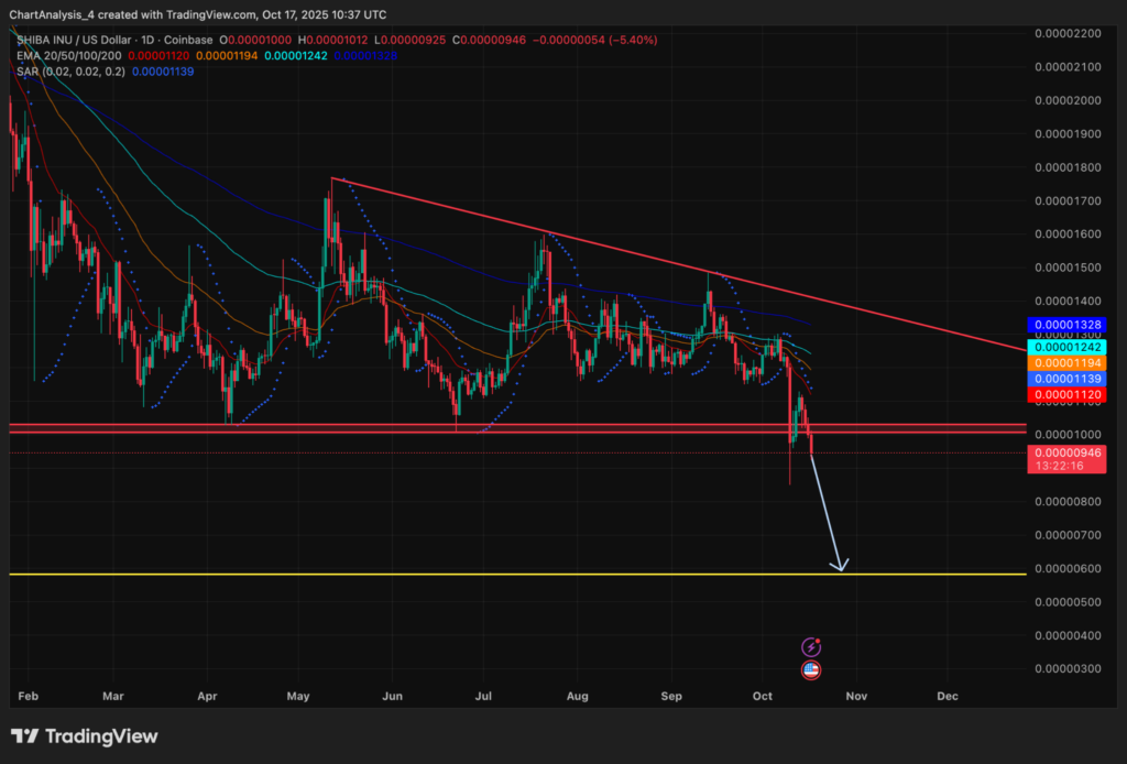 El precio del Shiba Inu ha caído por debajo de la zona de soporte crítica de 0,0000098-0,0000100 dólares, un nivel clave que se mantuvo firme durante gran parte de 2025.