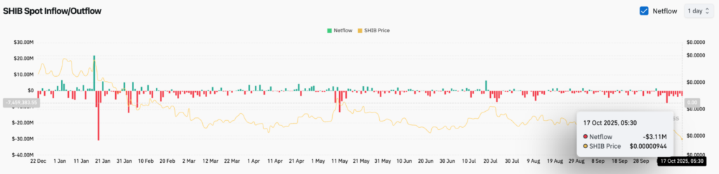 Los datos de Coinglass muestran que Shiba Inu registró 3,1 millones de dólares en salidas netas el jueves, prolongando una semana de retiradas.