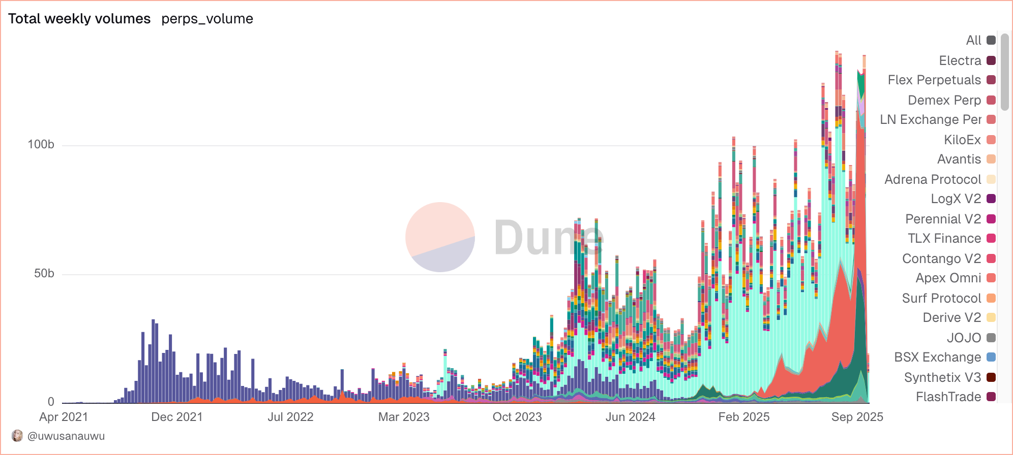 “El mercado de perpetuos superó 1 billón de dólares en volumen mensual. Hyperliquid, que dominó con más del 70% del volumen y el 90% del interés abierto, ahora tiene el 30% del volumen total y el 50% del interés abierto. Aster en BNB Chain y Variational en Arbitrum son competidores emergentes a través de derivados vinculados a rendimiento y peer-to-peer.”