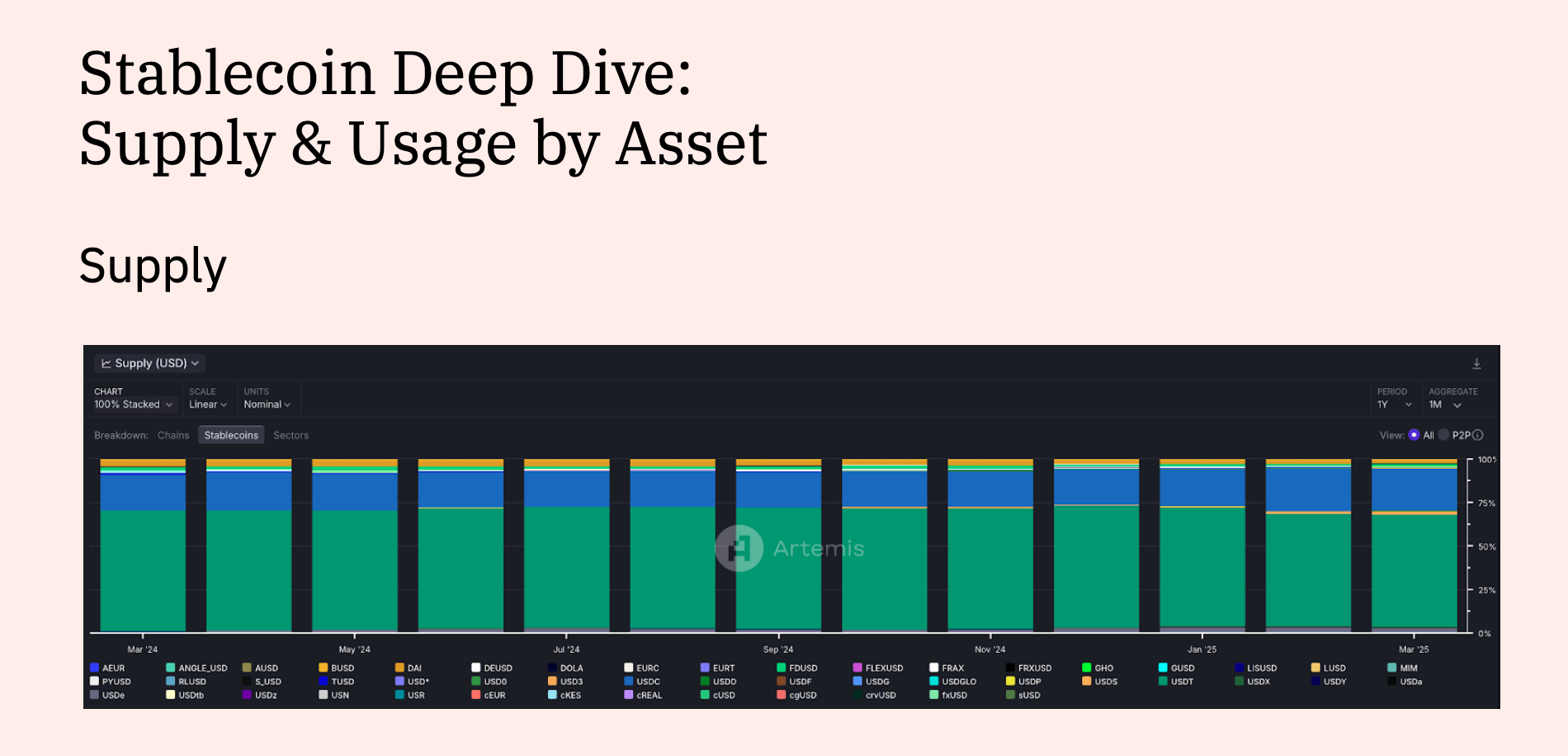 Un informe de Dune–Artemis dijo que el suministro total de stablecoins aumentó un 63% a 225 mil millones de dólares para febrero, procesando 35 billones de dólares en transferencias.