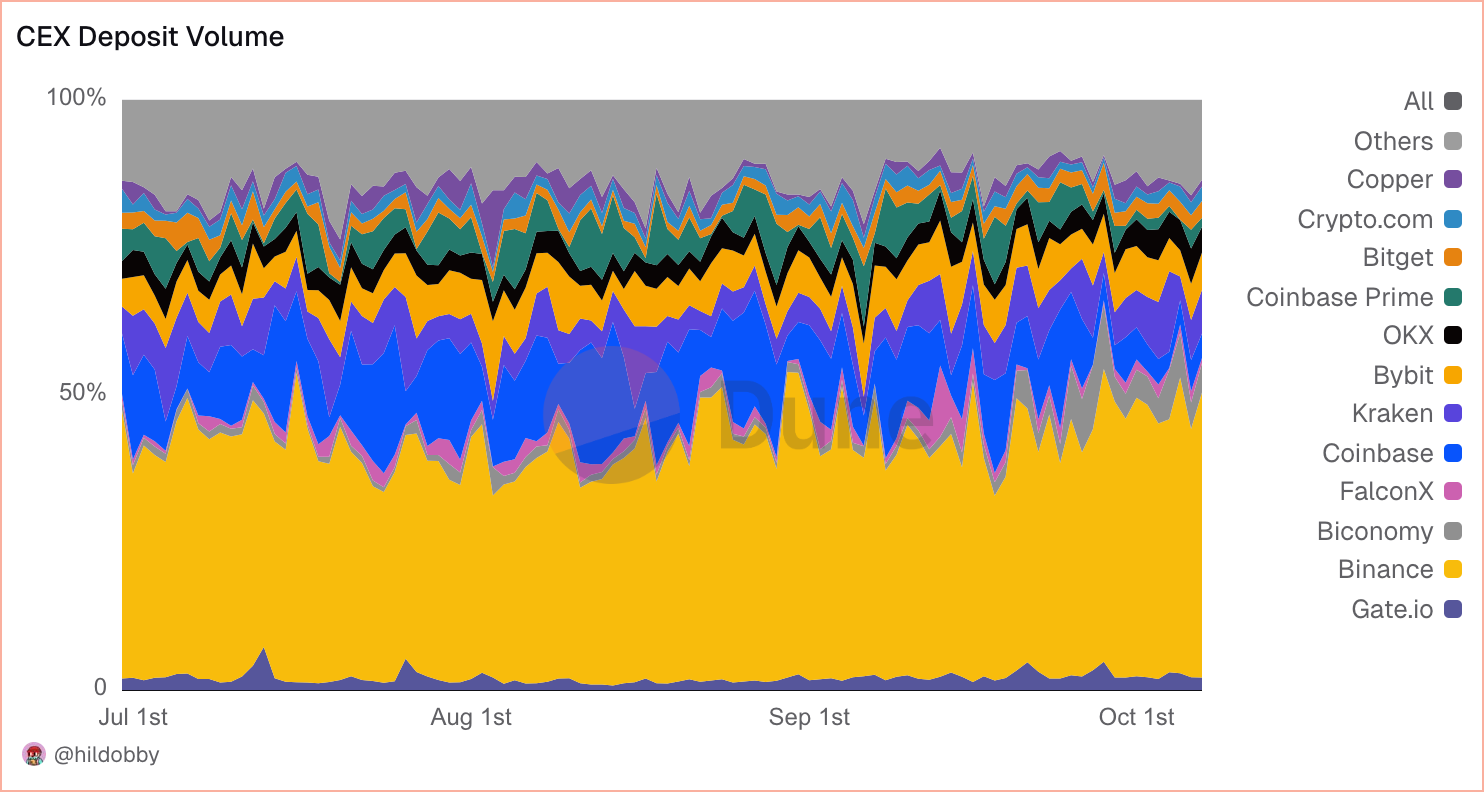 “Los paneles de Hildobby muestran que después de noviembre de 2023, los volúmenes de DEX comenzaron a superar a los de CEX. En 2025, el spot descentralizado alcanzó 857 mil millones de dólares en volumen mensual, en comparación con los depósitos en CEX cerca de 250 mil millones de dólares en su pico.”