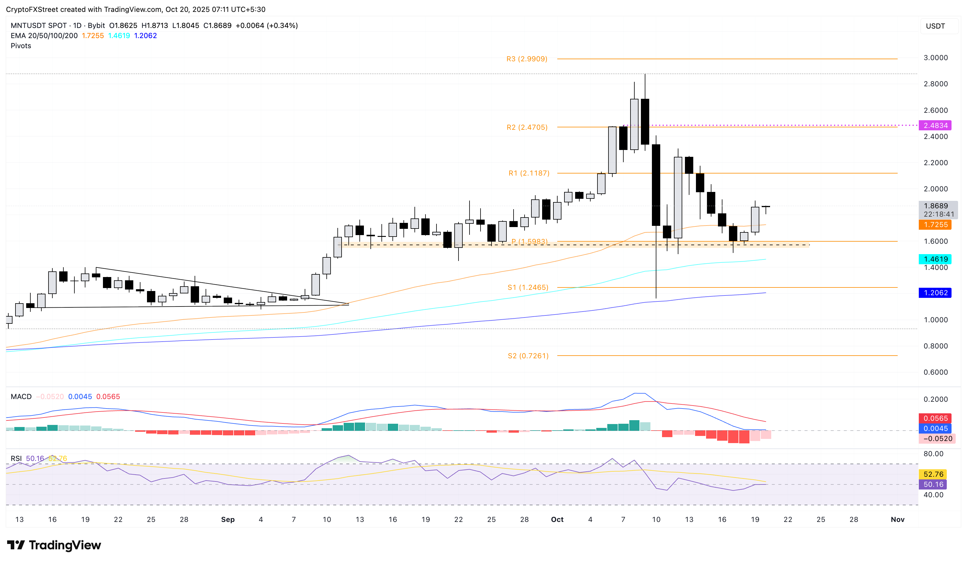 Mantle se mantiene estable por encima de 1.80$ en el momento de la redacción el lunes, tras dos días consecutivos de recuperación. La recuperación de MNT marca un rebote desde la zona de soporte de 1.59$, alineándose con el nivel central del Punto Pivote.
