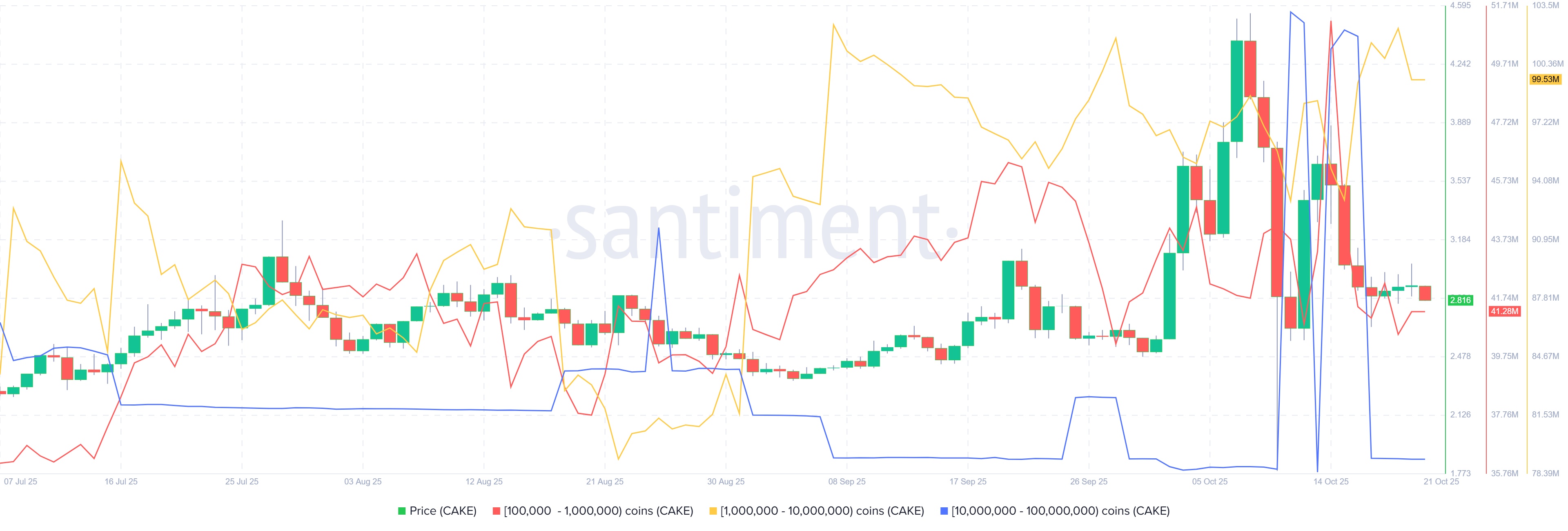 La métrica indica que las ballenas que poseen entre 100.000 y 1 millón (línea roja), de 1 millón a 10 millones (línea amarilla) y de 10 millones a 100 millones de tokens CAKE (línea azul) han reducido un total de 108.45 millones de tokens desde el 14 de octubre.