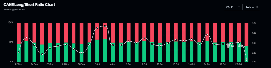 En el lado de los derivados, la relación larga-corta de Coinglass para CAKE lee 0.66 el martes, el nivel más bajo en un mes. La relación por debajo indica un sentimiento bajista, sugiriendo que los tenedores están apostando a que el precio del activo caiga.