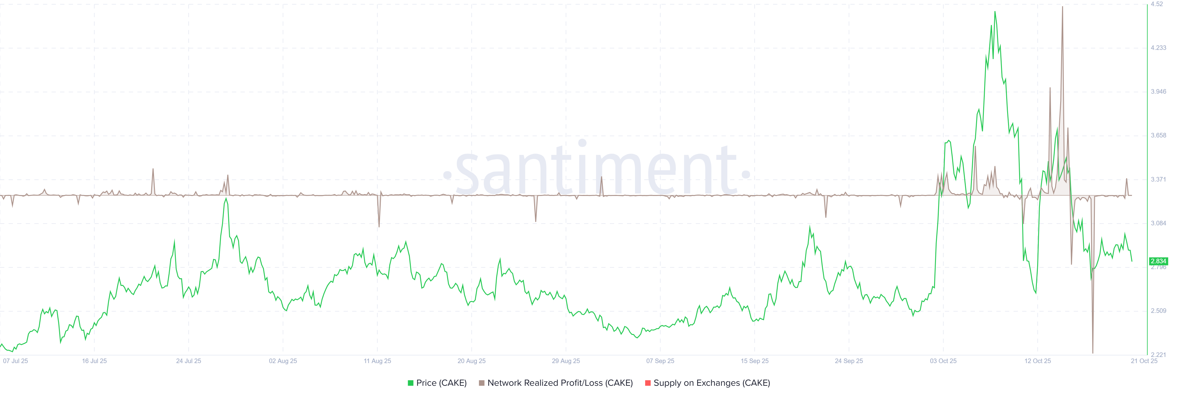 La métrica de Beneficio/Pérdida Realizado de la Red (NPL) de Santiment indica que los tenedores de PancakeSwap están registrando algunos beneficios.