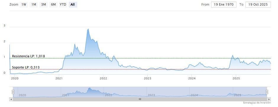 El soporte a mediano plazo se encuentra en los 0.42 dólares. Mientras, los indicadores de Ei se muestran prácticamente bajistas.