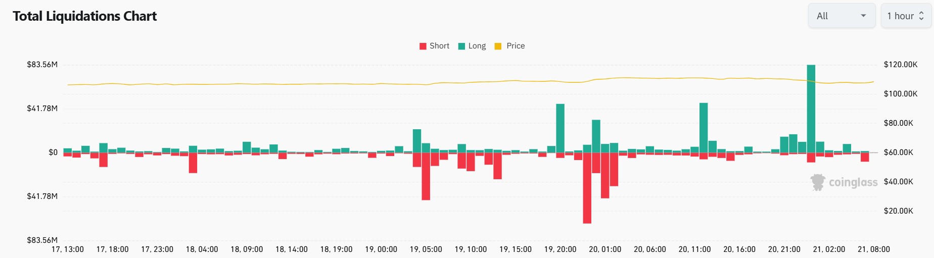 A continuación, el gráfico provisto por la plataforma CoinGlass permite observar estos movimientos liquidativos, acá se consideran operaciones en todas las criptomonedas, no solo en bitcoin.