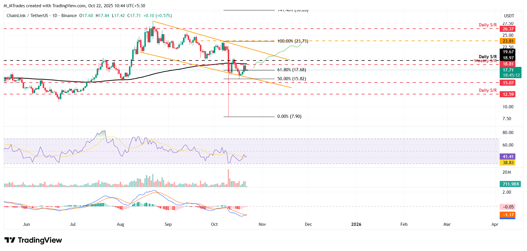 Si LINK se recupera y cierra por encima de la EMA de 200 días en 18.97$, podría extender la recuperación hacia la siguiente resistencia diaria en 23.81$.