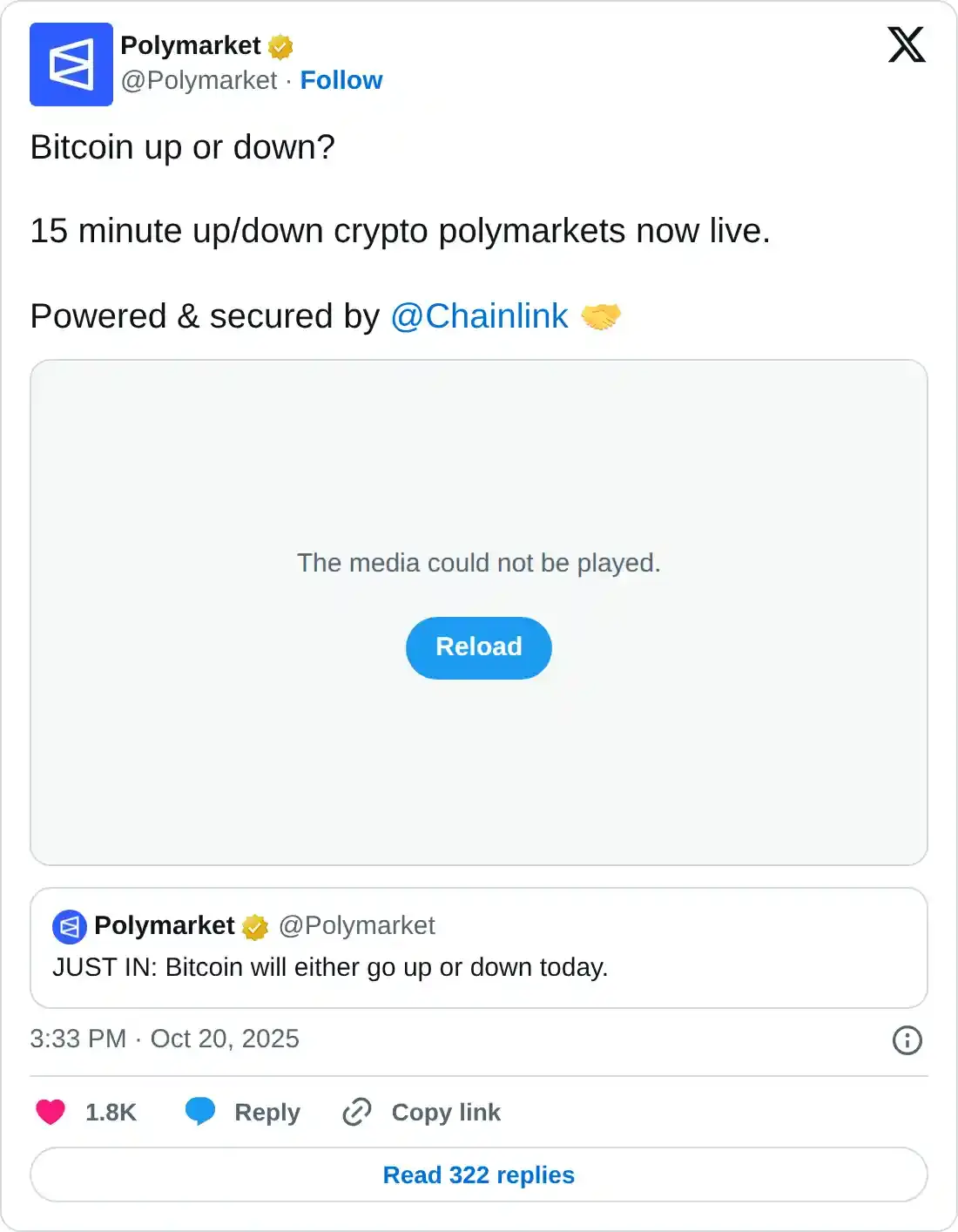 Chainlink anunció el lunes que Polymarket lanzó mercados de predicción de criptomonedas de 15 minutos en la plataforma.