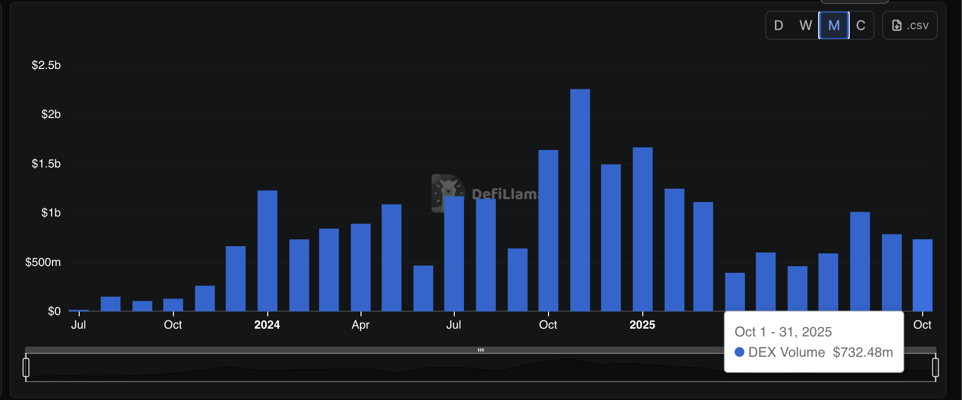 Aparte del mercado de derivados, un aumento en la actividad de usuarios en la red de Mantle podría impulsar la demanda de MNT, su token nativo. Los datos de DeFiLlama muestran que Mantle ha acumulado 732.48 millones de dólares en volumen mensual de DEX hasta ahora en octubre, marcando su tercer mes consecutivo por encima de 700 millones de dólares. A pesar de una caída desde 1.000 millones de dólares en volumen de DEX en agosto, la demanda se mantiene estable en un mercado volátil.