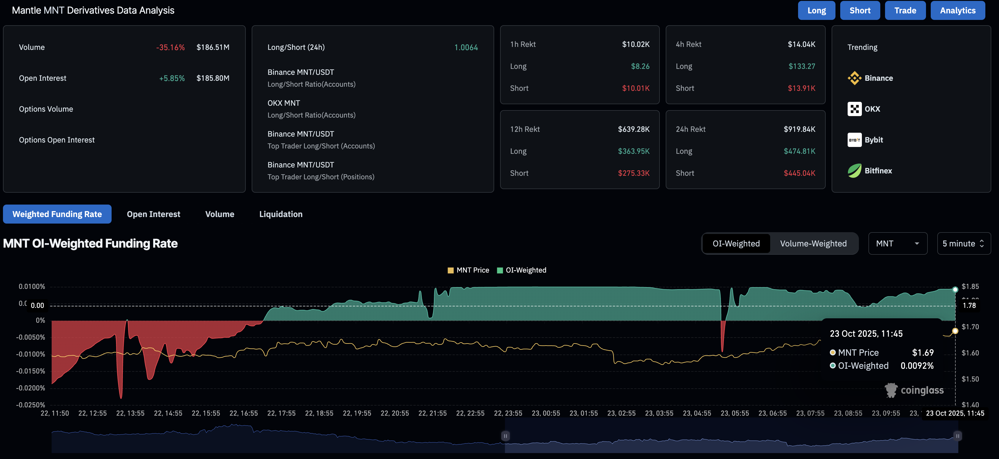 Mantle, uno de los pocos tokens que cotizan en verde en el momento de escribir el jueves, está ganando interés minorista, ya que los operadores anticipan más ganancias. Los datos de CoinGlass muestran que el interés abierto (OI) de futuros de MNT ha aumentado un 5.85% en las últimas 24 horas, alcanzando los 185.80 millones de dólares.