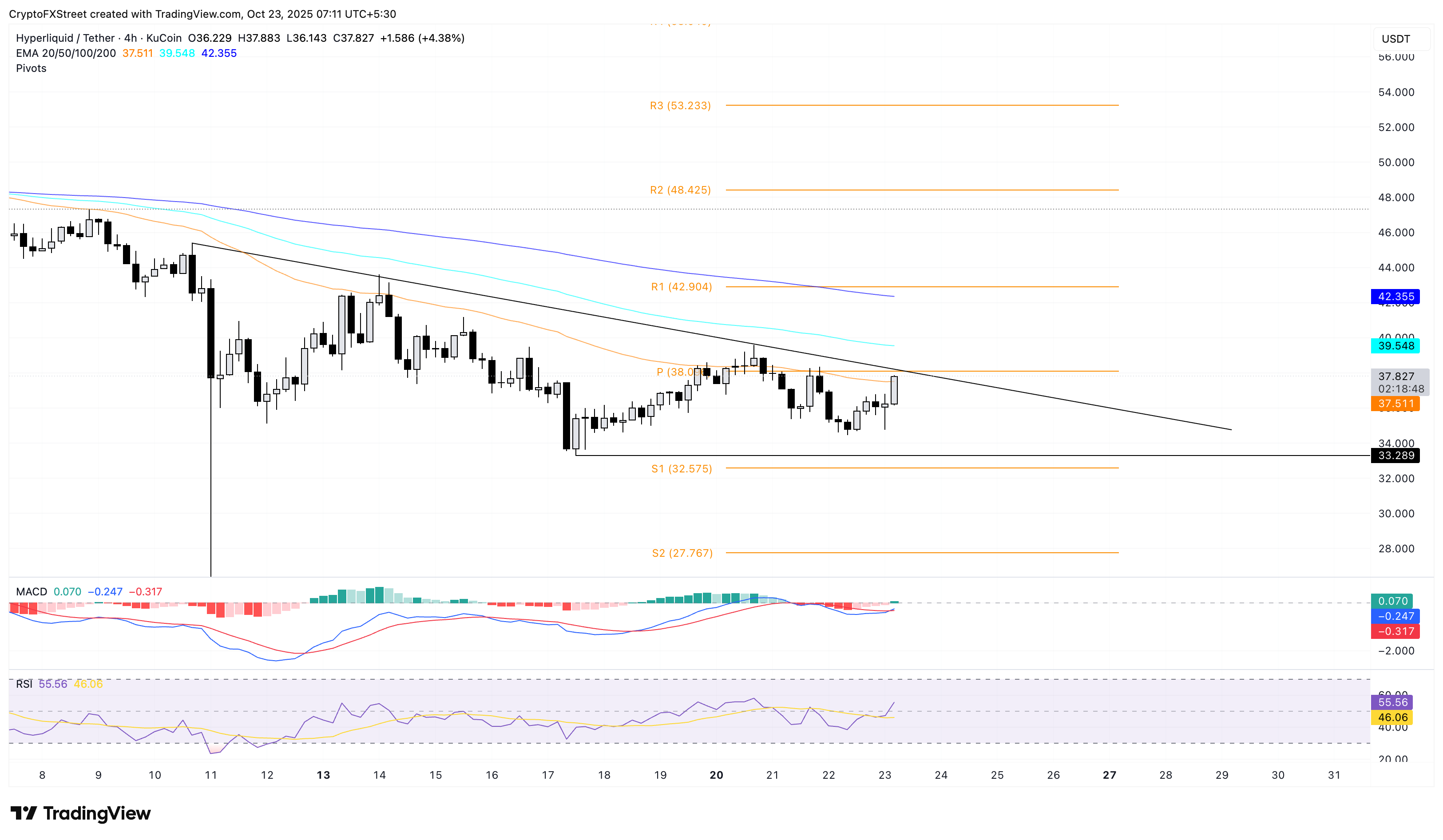 Hyperliquid avanza más de un 4% en el momento de la publicación el jueves, extendiendo el aumento del 2% del día anterior. La carrera de recuperación en el token de intercambio descentralizado (DEX) enfocado en perpetuos se acerca a una línea de tendencia de resistencia local, que completa un patrón de triángulo descendente con la línea base de 33.28$ marcada por el mínimo del viernes en el gráfico de 4 horas.