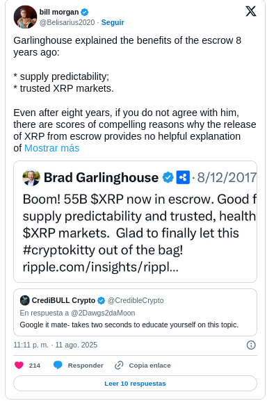 El comentario proviene de un artículo satírico que refleja un sentimiento compartido en parte del mercado: Ripple sigue liberando gradualmente su enorme reserva de XRP —unos 40 mil millones de tokens, valorados en más de 2.41 dólares cada uno— sin que quede claro su propósito real. Sin embargo, los inversores los compran, y eso ha permitido a Ripple acumular una fortuna considerable. Tanto, que esta semana la firma destinó 1 mil millones de dólares a la compra de GTreasury, una empresa especializada en gestión de tesorería corporativa.