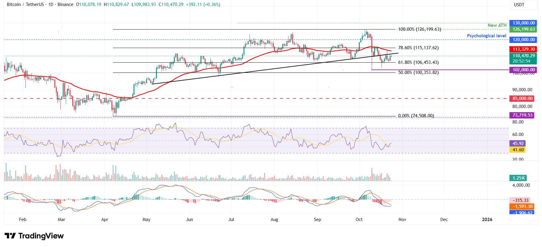El precio del Bitcoin enfrentó un rechazo en la media móvil exponencial (EMA) de 50 días en 113.329$ el martes y cayó un 2.81% al día siguiente. Sin embargo, el precio de BTC volvió a probar el nivel de retroceso de Fibonacci del 61.8% (dibujado desde el mínimo de abril de 74.508$ hasta el máximo histórico de 126.199$) en 106.453$ y se recuperó un 2.33% el jueves. En el momento de escribir el viernes, BTC se negocia por encima de 110.400$, acercándose a la línea de tendencia ascendente previamente rota.