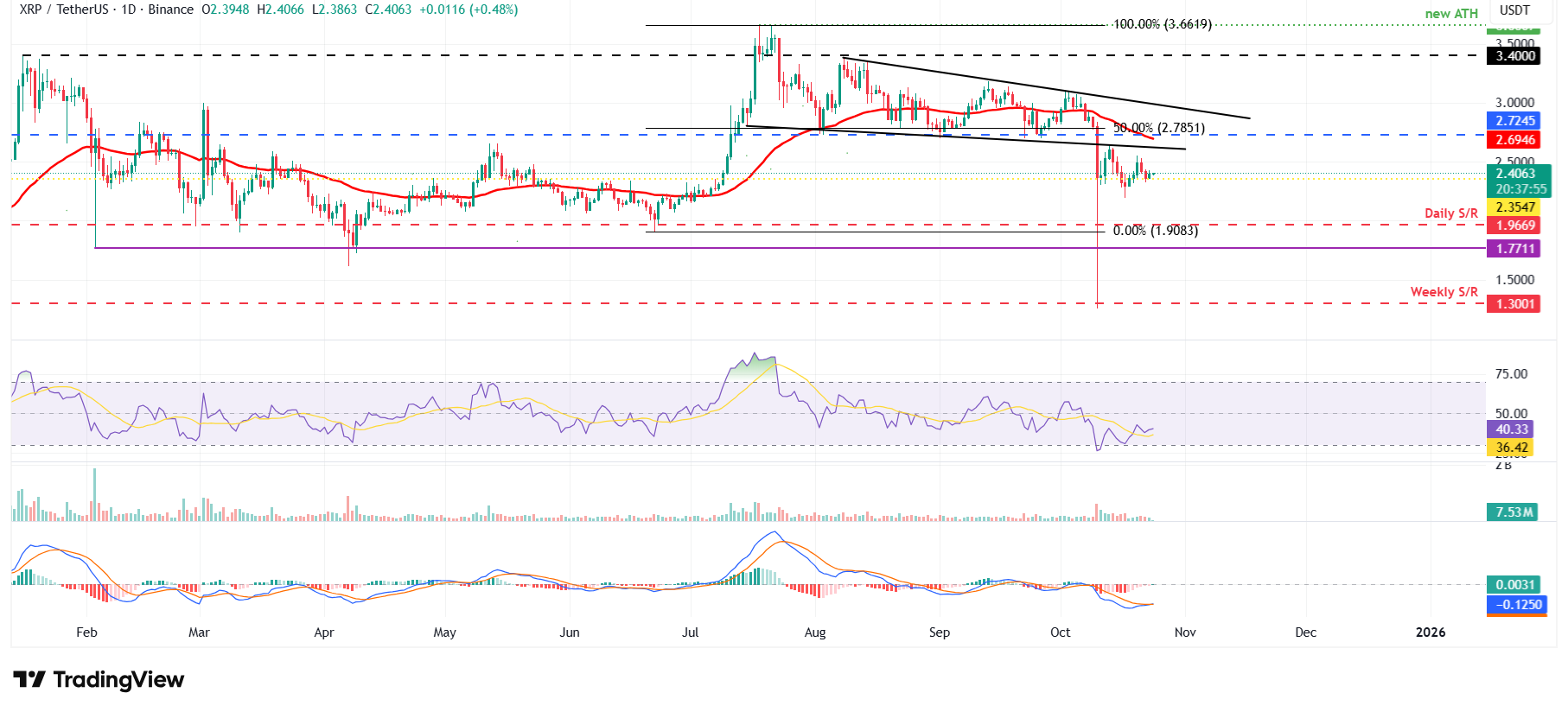 XRP comenzó la semana con una nota positiva, subiendo un 4.35% y cerrando por encima del nivel de resistencia diaria en 2.35$ el lunes. Sin embargo, XRP cayó durante los siguientes dos días, borrando sus ganancias del lunes y volviendo a probar el nivel diario en 2.35$. XRP encontró soporte alrededor de 2.35$ y se recuperó ligeramente el jueves. En el momento de escribir el viernes, XRP está extendiendo su recuperación, negociándose por encima de 2.40$.