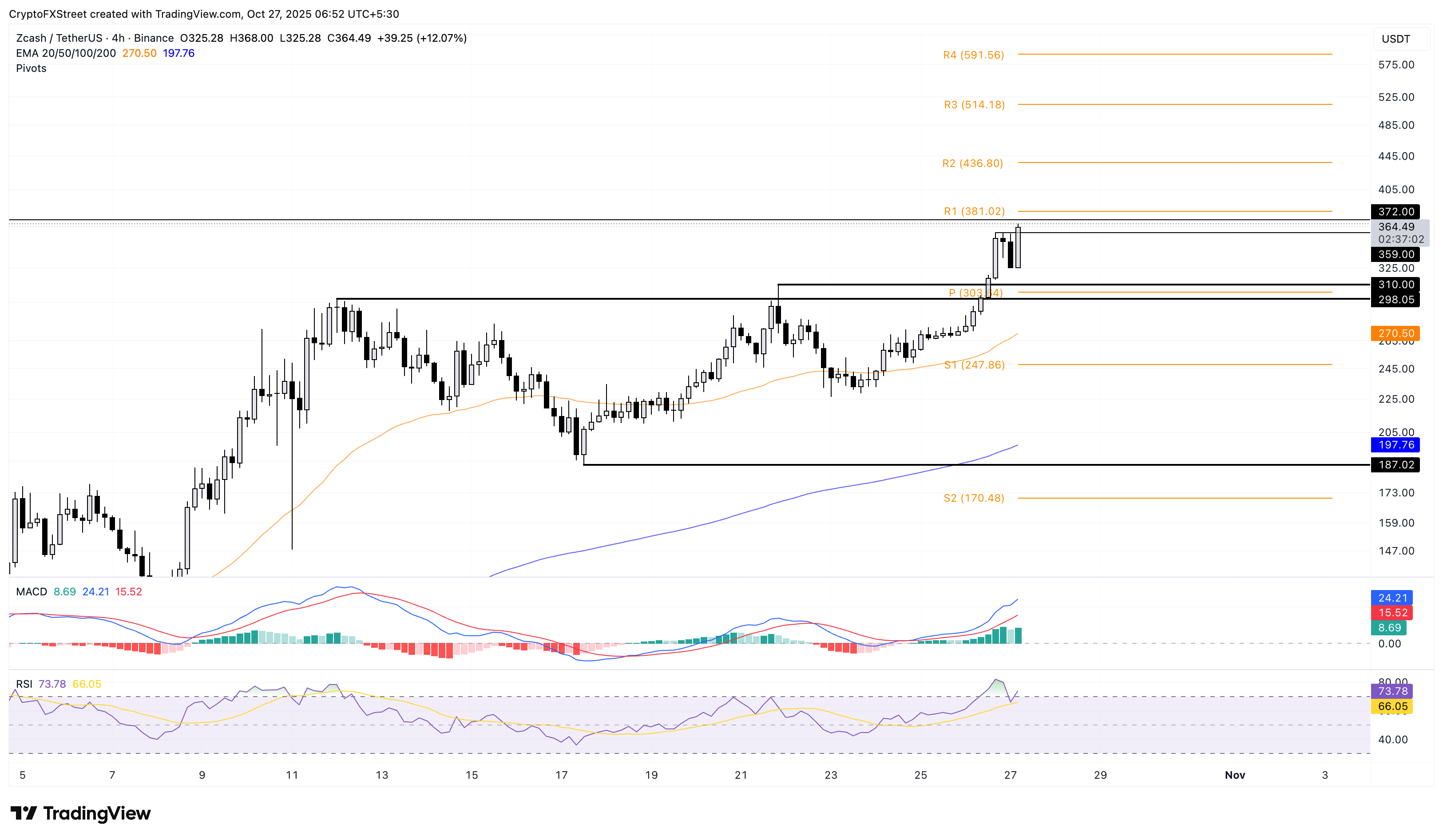 Zcash avanza un 12% en el momento de la publicación el lunes, extendiendo las ganancias del 17% del domingo. Con el quinto día consecutivo de tendencia alcista, la moneda de privacidad se acerca al máximo histórico de $372 y al Punto Pivote R1 en $381, ambos niveles que sirven como resistencia en el gráfico de 4 horas.