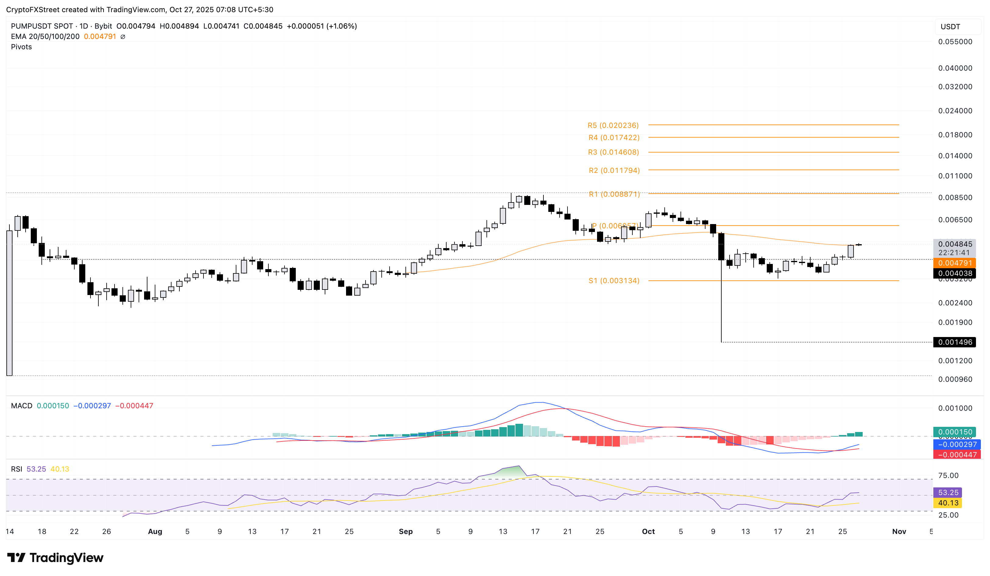 Pump.fun se mantiene estable por encima de la EMA de 50 días en $0.004788 en el momento de escribir el lunes. El token PUMP ha añadido un 1% en el día hasta ahora, tras el aumento del 15% del día anterior.