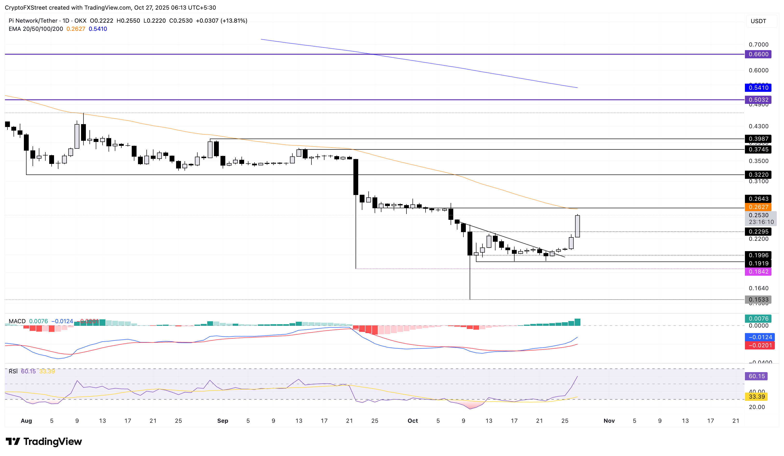 Pi Network cotiza por encima de $0.2500 en el momento de la publicación el lunes, acercándose a la media móvil exponencial (EMA) de 50 días en $0.2627. El token PI ha subido un 13% en el día hasta ahora, sumando a las ganancias del 7% del domingo.